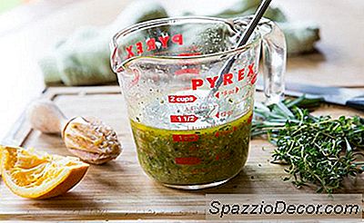 Bước 2: Trong một cốc đo thủy tinh, đổ cốc dầu ô liu 1 / 2 (hoặc bơ tan chảy), nước cam từ 1 cam (tiết kiệm vỏ!), Nước chanh, tỏi băm, cây xô thơm băm nhỏ, hương thảo, húng tây, muối và hạt tiêu. Râu tốt.